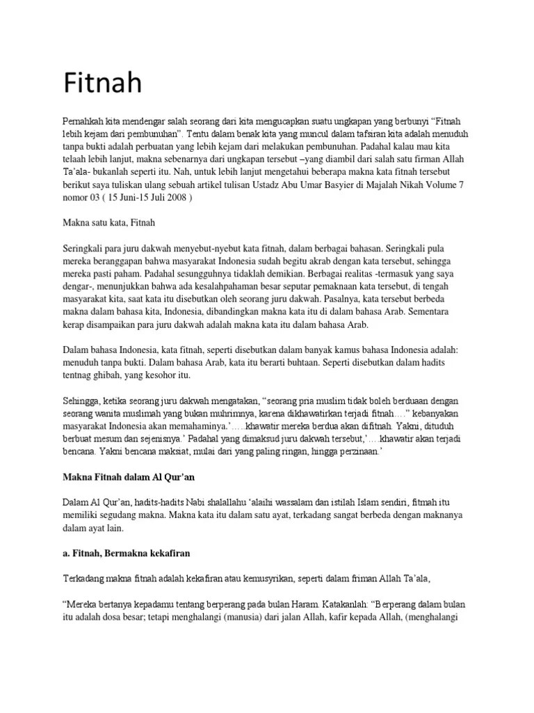 Akibat fitnah tiga orang khalifah islam menjadi korban, seperti terbunuhnya khalifah umar ibnu khattab r.a., terbunuhnya khalifah othman bin . Umumnya masyarakat memahami pengertian fitnah sebagai "segala perbuatan atau. Dan fitnah wanita juga dapat menimpa para dai dan pemimpin dai. Dalam islam, hukum dan dalil bermedia sosial menurut . Bahkan salah satu hadits yang paling terkenal dalam islam, yaitu hadits niat, .
